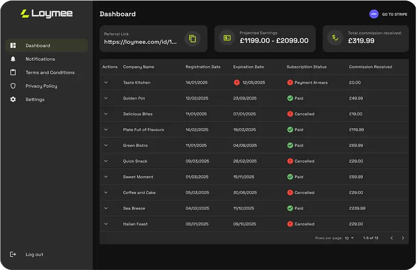 All commissions are automatically paid via Stripe – on the 7th of each month.