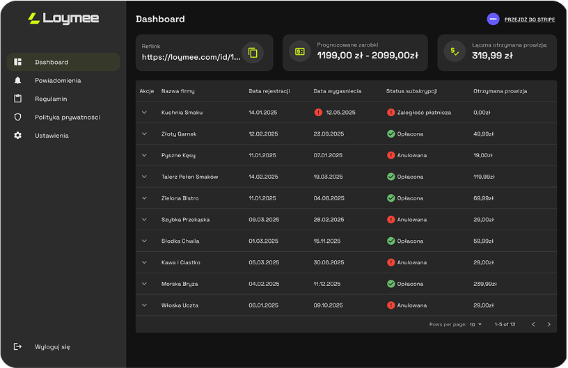 Wszystkie prowizje wypłacane są automatycznie przez Stripe – 7. dnia każdego miesiąca.